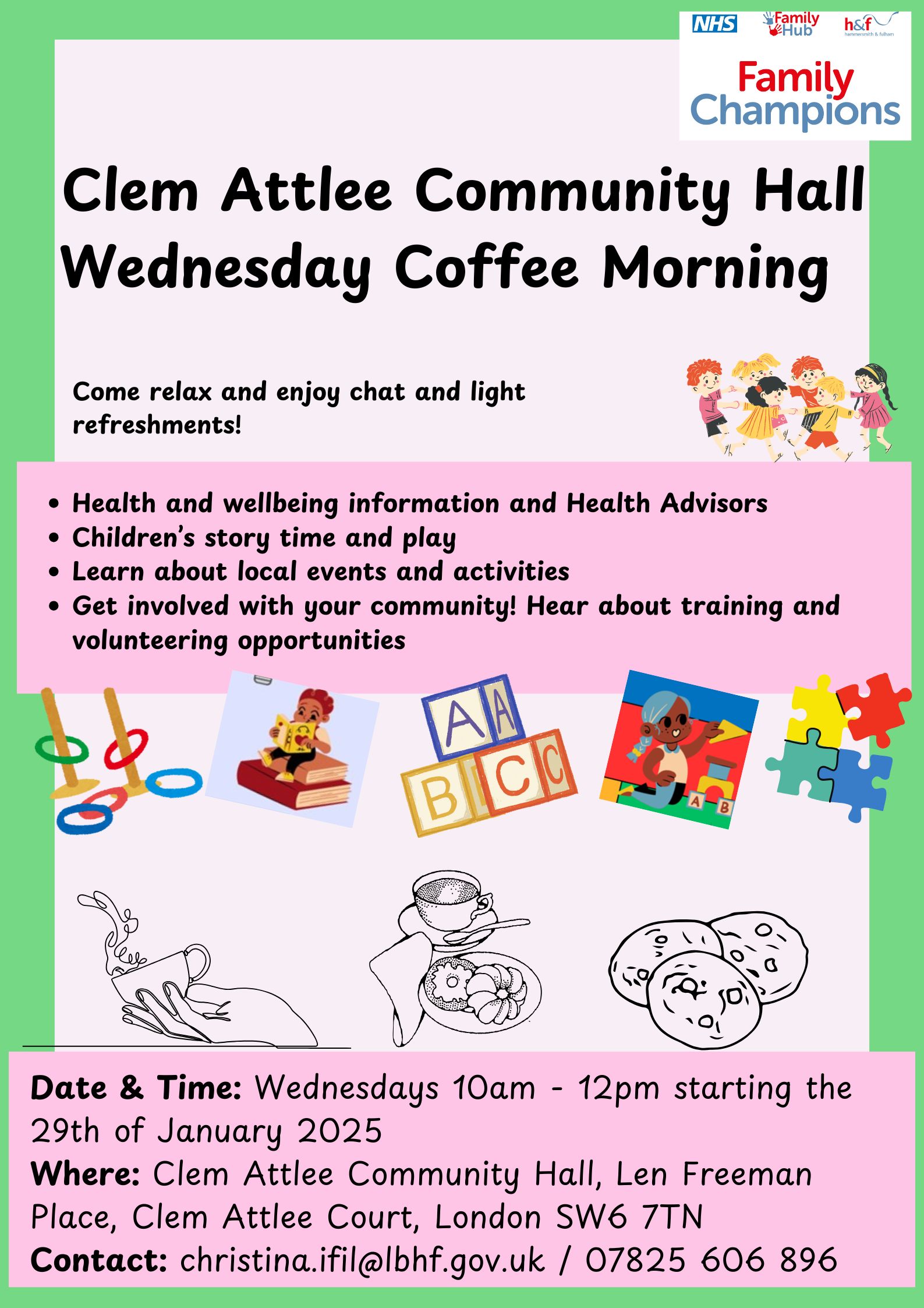 Family Champions are holding Wednesday Coffee Mornings at Clem Atlee Community Hall for families.